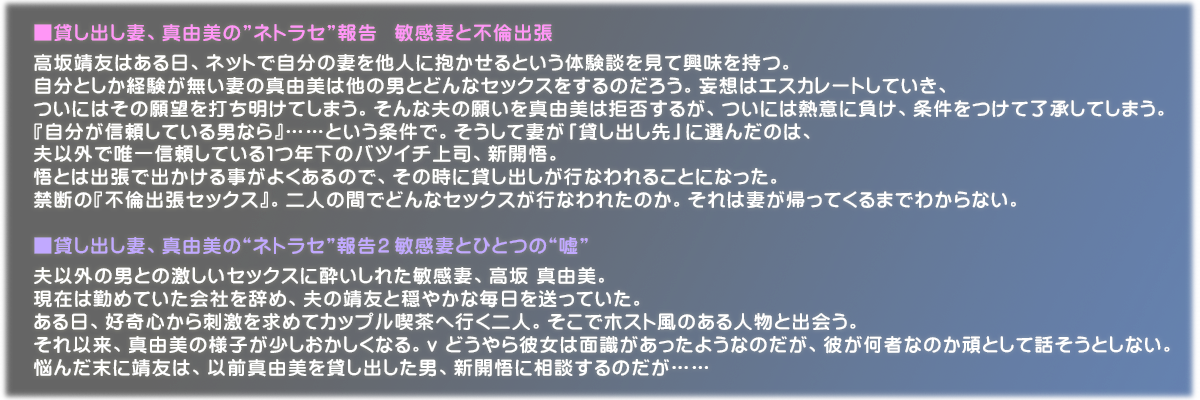 タイトル:貸し出し妻、真由美の“ネトラセ”報告 1+2 リニューアルパッケージ版